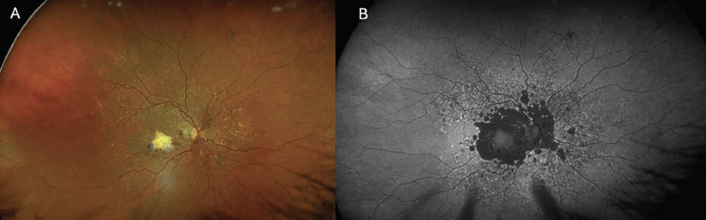Existen innumerables aplicaciones de la FAF en la práctica clínica, siendo la más práctica detectar o monitorear la progresión de la AG en pacientes con DMAE. El Informe 3 de la Reunión sobre Clasificación de Atrofia (CAM) describió los hallazgos de la FAF en la AG como (1) bordes claramente demarcados, (2) una señal de hipo-AF similar a la cabeza del nervio óptico o los vasos sanguíneos de la retina, y (3) un diámetro de ≥250 µm. 10 La detección temprana de la AG es importante para la educación del paciente sobre su estado de enfermedad, así como para una posible intervención terapéutica. Alternativamente, la FAF se recomendó en las pautas de la Academia Estadounidense de Oftalmología de 2016 para la detección de la maculopatía por hidroxicloroquina y se recomienda anualmente además de la OCT y la prueba del campo visual 10-2 después de cinco años de uso del fármaco. 11 La FAF de campo ultra amplio también es una herramienta poderosa para detectar la enfermedad retiniana hereditaria o la enfermedad uveítica, las cuales a menudo tienen hallazgos tempranos sutiles en el examen clínico ( Figura 5 ).