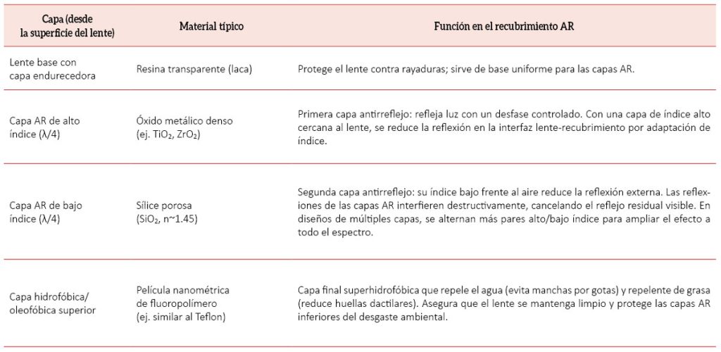 El tratamiento antirreflejante es un recubrimiento óptico multicapa diseñado para cancelar las reflexiones indeseadas en la superficie de los lentes. A nivel técnico, se compone de una serie de capas ultrafinas (del orden de nanómetros de espesor) hechas típicamente de óxidos metálicos con distintos índices de refracción (como el Zirconio o el Silicio), depositadas sobre el lente mediante procesos de vacío y alta tecnología. Cada capa está calculada para que la luz reflejada en sus interfaces se desfase respecto a la reflejada en las otras capas, de modo que se produzca interferencia destructiva entre los reflejos. En otras palabras, las ondas de luz reflejada se anulan entre sí al estar fuera de fase, eliminando casi por completo el reflejo total.